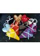 Filled with hollow fibre. Decorated with 6mm satin ribbon, cut heart and cotton bobbin lace and chain cord for hanging.
